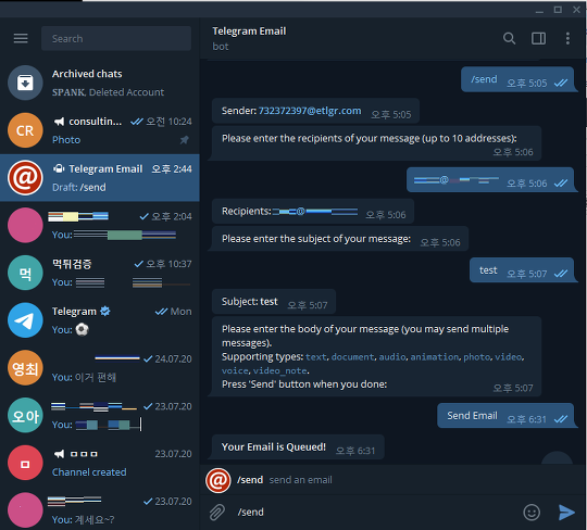 우선 텔레그램에서 Telegram Email 봇을 친구추가해줘야한다.